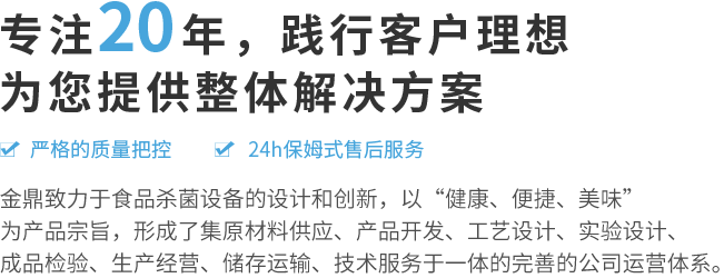 我们致力于食品杀菌的设计和创新,以“健康、便捷、美味”为产品宗旨,研发了适合不同客户、不同产品的系列杀菌釜。历经多年风雨拼搏,取得了喜人的成绩,同时也为行业的发展做出了不可磨灭的贡献。